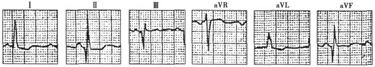 | 正确答案:E 解题思路:心电图特点为:窦性心律,心率为80次/分,PR间期为0.10s,QRS波群时限为0.12s,各导联QRS波群起始部可见delta波,诊断为预激综合征。Ⅱ、Ⅲ、aVF导联呈负向delta波,酷似病理性Q波。该心电图表现应注意与下壁心肌梗死、左心室肥大伴劳损、左束支阻滞、心肌缺血等相鉴别。 |