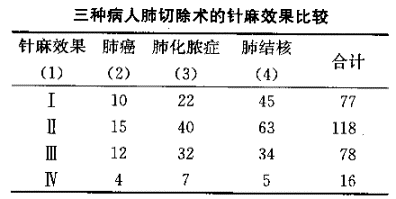 研究者对三种病人肺切除术的针麻效果进行了研究,得下列资料:![]() |
