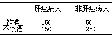 | 4.选择300例肝癌患者和300例对照进行饮酒与肝癌关系的病例对照研究,调查发现300例患者中有150人饮酒,300例对照中有50人饮酒,肝癌与饮酒的相对危险度是 |