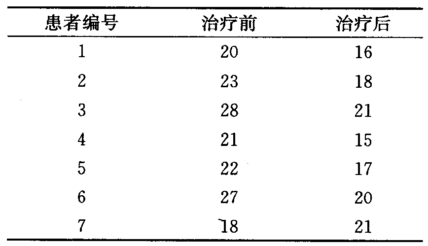7名肺结核患者用某药治疗前后红细胞沉降率(mm/h)如下:![]() |