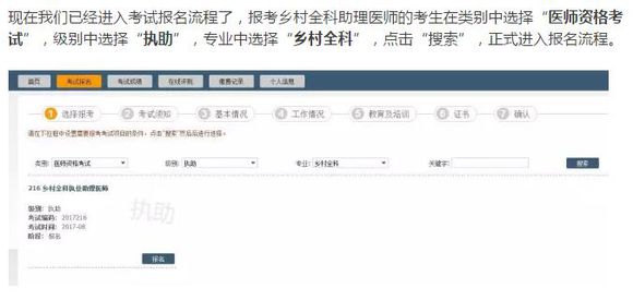 现在我们已经进入考试报名流程了,报考乡村全科助理医师的考生在类别中选择“医师资格考试”,级别中选择“执助”,专业中选择“乡村全科”,点击“搜索”,正式进入报名流程。