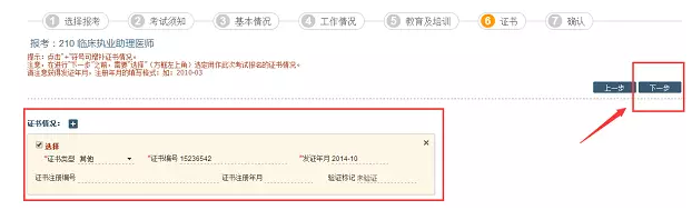十、填写已获证书情况,注明证书类型、编号及发证时间。点击右上角“下一步”。
