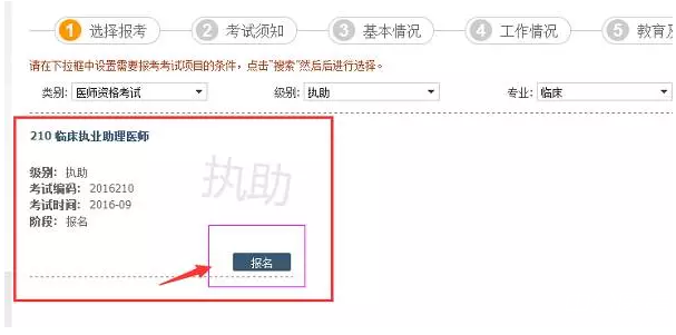 四、进入后按照选择报考(类别、级别、专业)→考试须知→基本情况→ 工作情况→教育与培训→ 证书→确认的流程进行搜索出报考对应内容,点击报名: