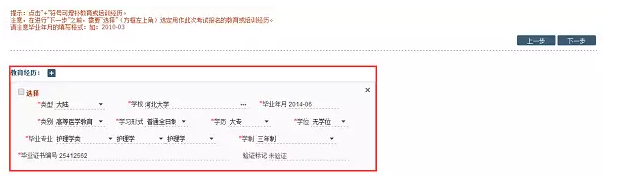 九、填写教育及培训情况,学校、毕业日期、类别、学习形式、学历、学位、专业、学制、毕业证书编号等信息,以上内容严格按照毕业证上填写,确认无误后点击右上角下一步。