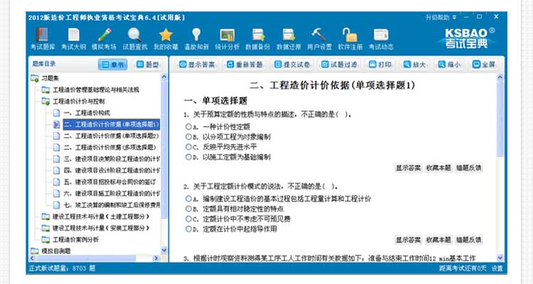 《造价工程师执业资格考试宝典》系造价工程师考试试题辅导软件,适用于造价工程师考试,软件试题库设计紧扣最新造价工程师考试大纲、考试教材,符合造价工程师考试考试题型与考试科目,复习辅导资料、考试资料丰富,免费试用、试题库巨大(注册版试题量达8703多题、90万多字),辅导软件收录造价工程师考试复习试题集、模拟试题、历年试题,试题辅导软件囊括了目前所有的最新造价工程师考试科目:工程造价管理基础理论与相关法规、工程造价计价与控制、建设工程技术与计量(土建工程部分)、建设工程技术与计量(安装工程部分)、工程造价案例分析、模拟试卷、历年试题。