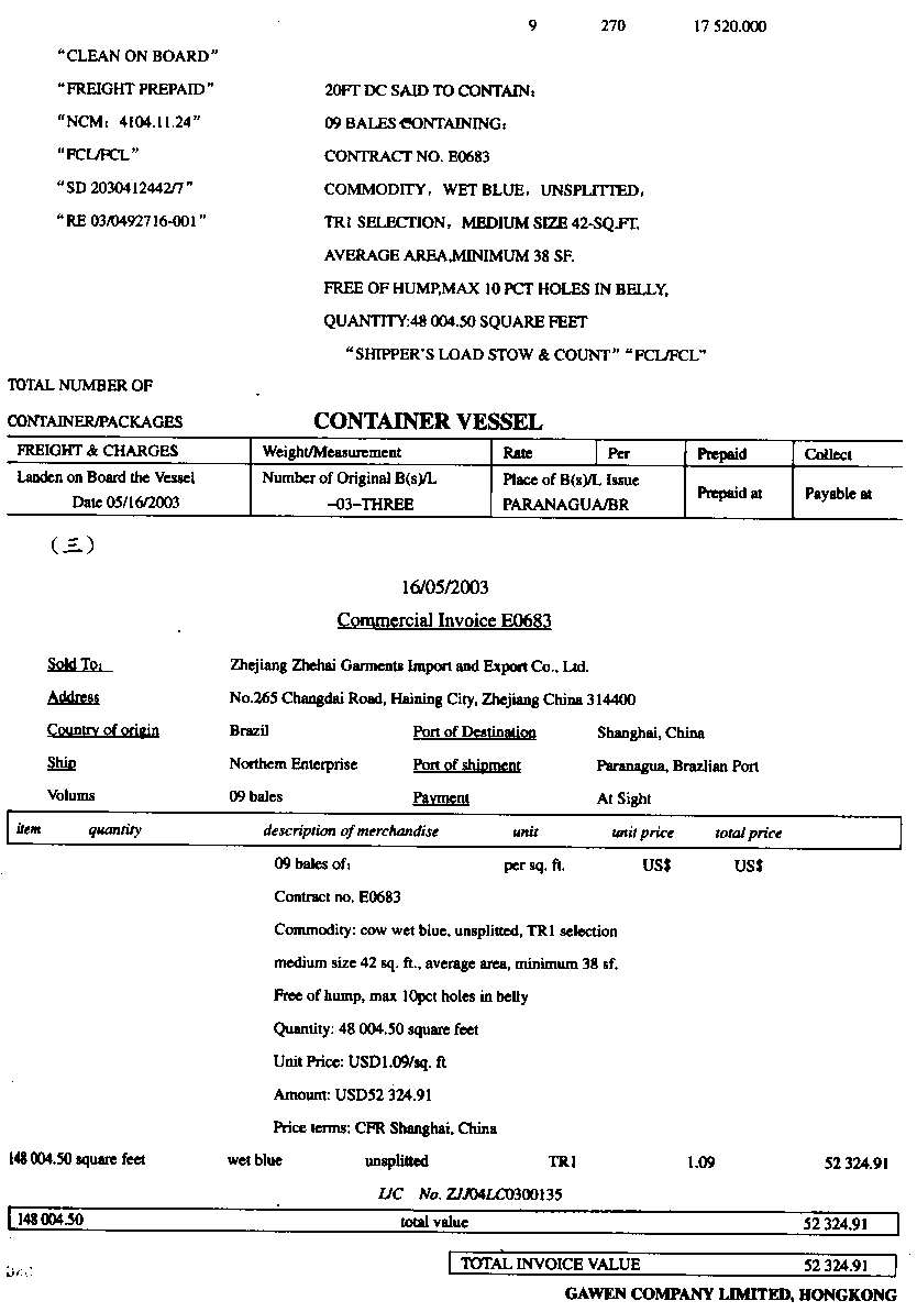 浙江浙海服装进出口/公司(3313910194)在对口合同项下进口蓝湿牛皮,委托浙江嘉宁皮革有限公司(3313920237)加工牛皮沙发革。承运船舶在帕腊纳瓜港装货启运,航经大阪,又泊停釜山港转"HANSA STAVANGER"号轮HV300W航次(提单号:HS03D8765)于2003年7月30日抵吴淞口岸申报进境。经营单位委托上海某货运代理公司持C29083100693号手册和310200103036124号入境货物通关单(代码:A)于次日向海关申报货物进口。该货物法定计量单位为千克,海运费、港杂费合计1 500美元,保险费为140美元。![]() ![]() ![]() ![]() 请根据以上资料,填制进口报关单以下栏目: |