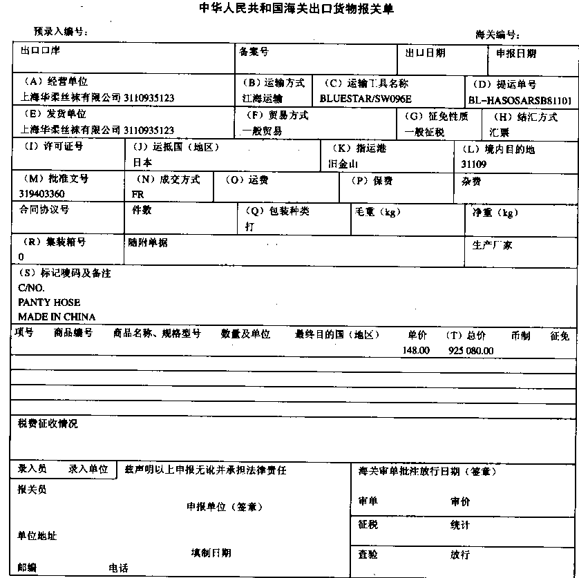 | 正确答案:G H O Q T 解题思路:(G):征免性质栏填制错误,应填"中外合资"。(H):结汇方式栏填制错误,由发票可知应为D/D,即票汇,依据《规范》填写为票汇。(O):运费栏填制错误,该货物以CFR成交,依据《规范》出口应填报运费,不能为牢。(Q):包装种类栏填制错误,依据《规范》"包装种类"应填写实际的外包装种类,由发票、箱单可知,应为纸箱。(T):总价栏填制错误,因为对应单价148日元的商品总价是78 144日元,而不是925 080.00日元:925 080.00日元应为所有货物的总价。货物向海关申报时应按不同的单价、总价分别填报 |