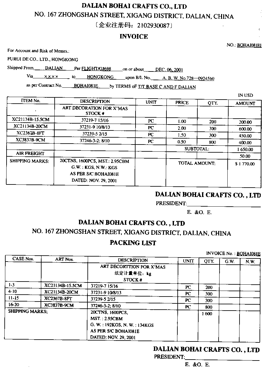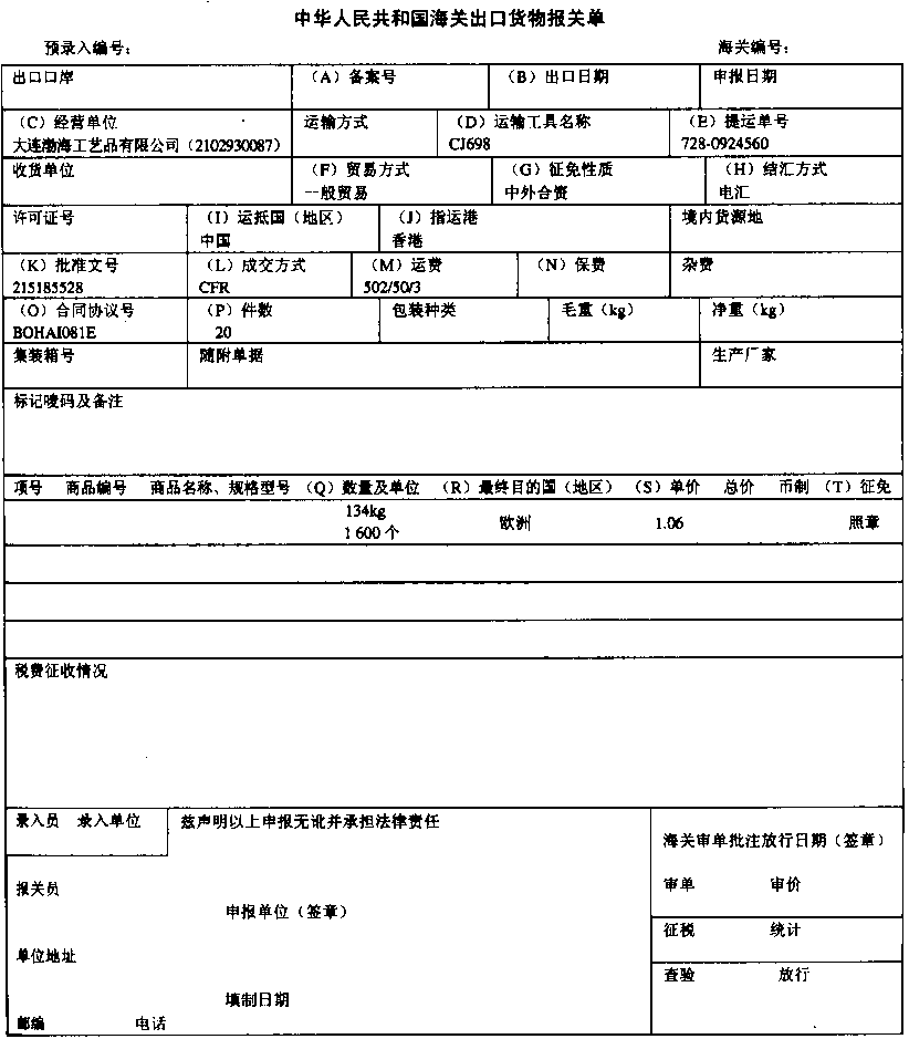 22.香港富瑞达公司向中外合资大连渤海工艺品有限公司订购一批自产圣诞装饰品,准备在圣诞节前销往欧洲市场。大连渤海工艺品有限公司持215185528号出口收汇核销单,于2001年12月5日向海关申报,次日出口。![]() ![]() |