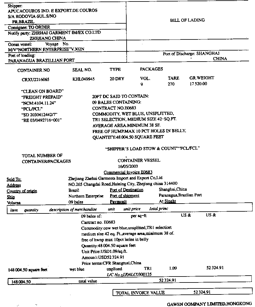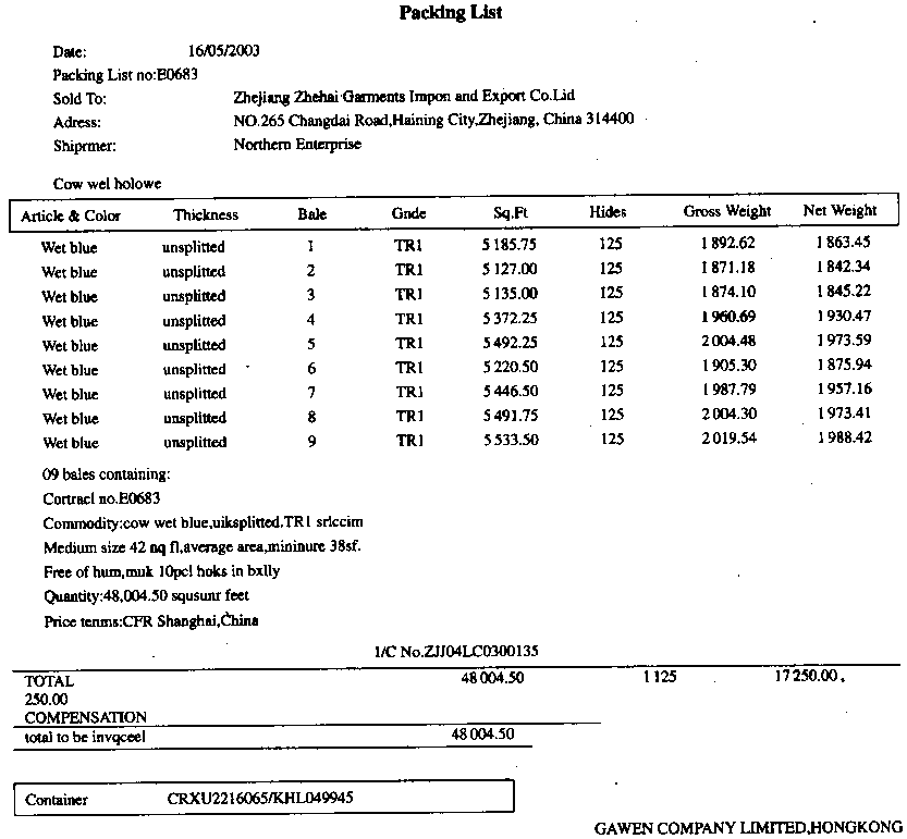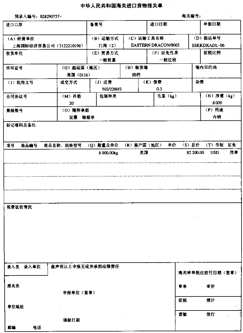 ![]() 浙江浙海服装进出口公司(3313910194)在对口合同项下进口蓝湿牛皮,委托浙江嘉宁皮革有限公司(3313920237)加工牛皮沙发革。承运船舶在帕腊纳瓜港装货启运,航经大阪,又泊停釜山港转"HANSA STAVANGER"号轮HV300W航次(提单号:HS03D8765),于2003年7月30日抵吴淞口岸申报进境。经营单位委托上海某货运代理公司持C29083100693号手册和310200103036124号入境货物通关单(代码:A)于次日向海关申报货物进口。该货物法定计量单位为:kg,海运费、港杂费合计1 500美元,保险费为140美元。 ![]() ![]() |