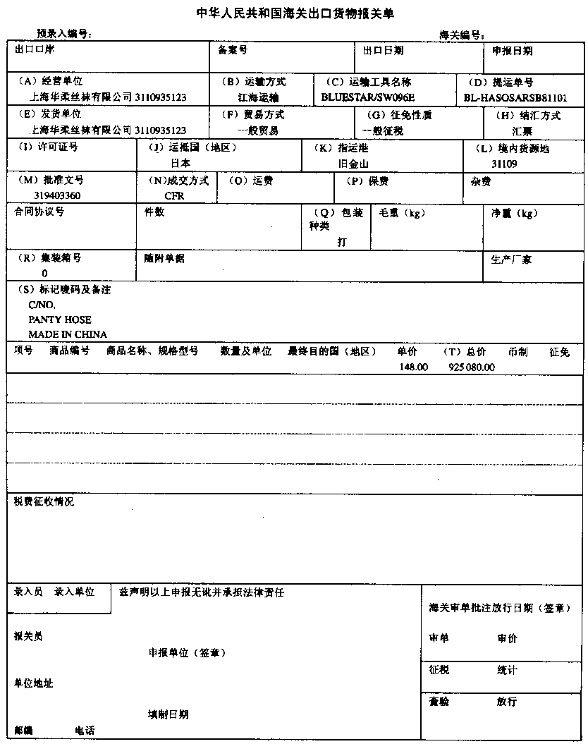 ![]() 浙江浙海服装进出口公司(3313910194)在对口合同项下进口蓝湿牛皮,委托浙江嘉宁皮革有限公司(3313920237)加工牛皮沙发革。承运船舶在帕腊纳瓜港装货启运,航经大阪,又泊停釜山港转"HANSA STAVANGER"号轮HV300W航次(提单号:HS03D8765),于2003年7月30日抵吴淞口岸申报进境。经营单位委托上海某货运代理公司持C29083100693号手册和310200103036124号入境货物通关单(代码:A)于次日向海关申报货物进口。该货物法定计量单位为:kg,海运费、港杂费合计1 500美元,保险费为140美元。 ![]() ![]() |