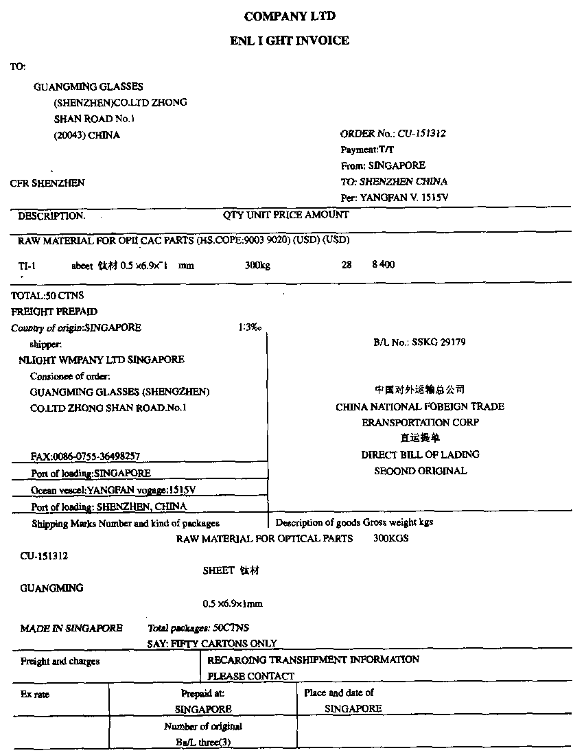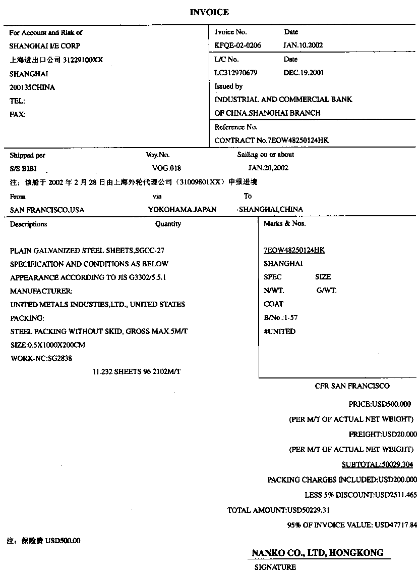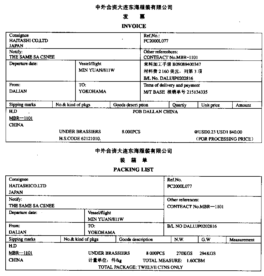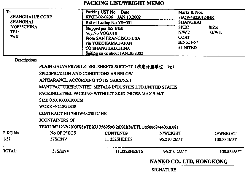 | 南京科越纸业有限公司属于合资企业,专营纸张生产加工。该公司2003年6月与香港龙胜贸易公司签约,购买一台CIF18 000美元,在总投资额度内的切纸机,该设备属于《外商投资产业目录》中鼓励进口项目,该设备于2003年10月19日由中远运输公司的"DA QING HE VOY.302"船载运进口,该合资企业于2003年11月7日向上海吴淞海关办理申请转关手续后由"狮子星"号轮船于2003年11月9号运抵南京,并于2003年11月20日向南京海关办理进口报关手续,海关查验后放行。 |