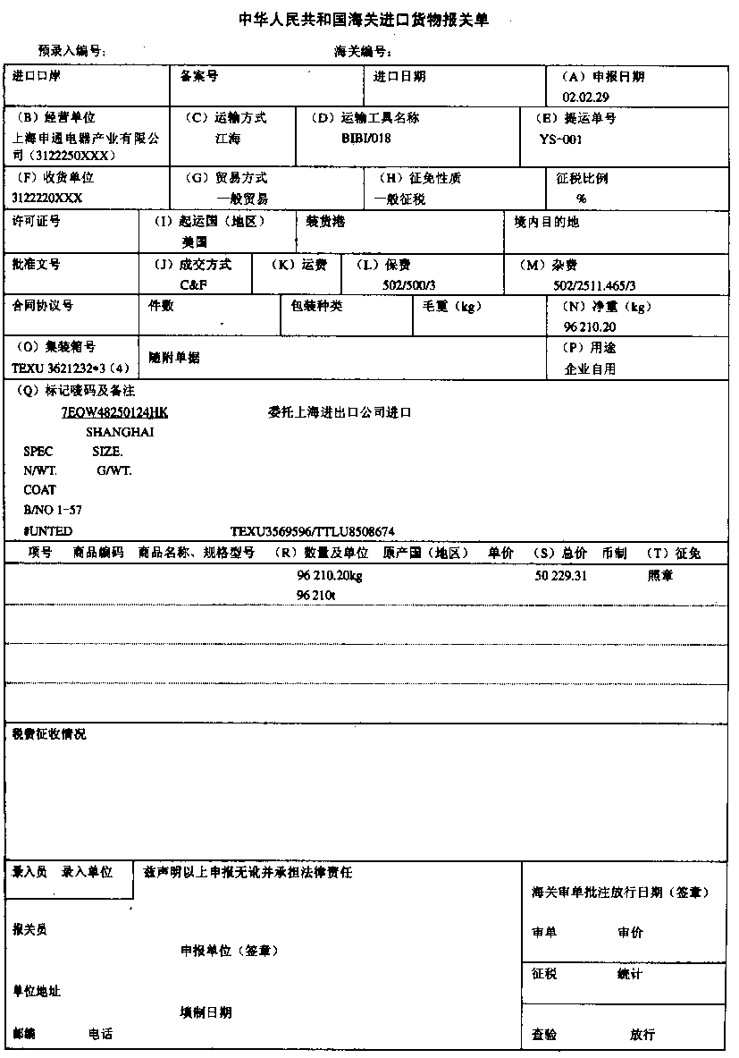 49.本题中,货物由上海申通电器产业有限公司(3122250×××)委托上海进出口公司进口,用于生产空调设备供应国内市场。船舶进口次日委托上海华利物流有限公司(3122980×××)向海关申报。![]() ![]() ![]() |