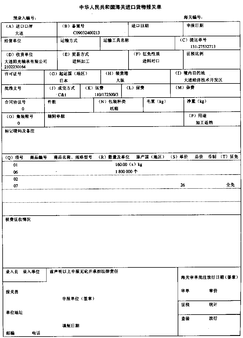 | 正确答案:A、N、F、K、R 解题思路:A.应为大连海关N.应为托盘F.应为进料加工K.应为116/172 500/3R.应为1 800 000 |