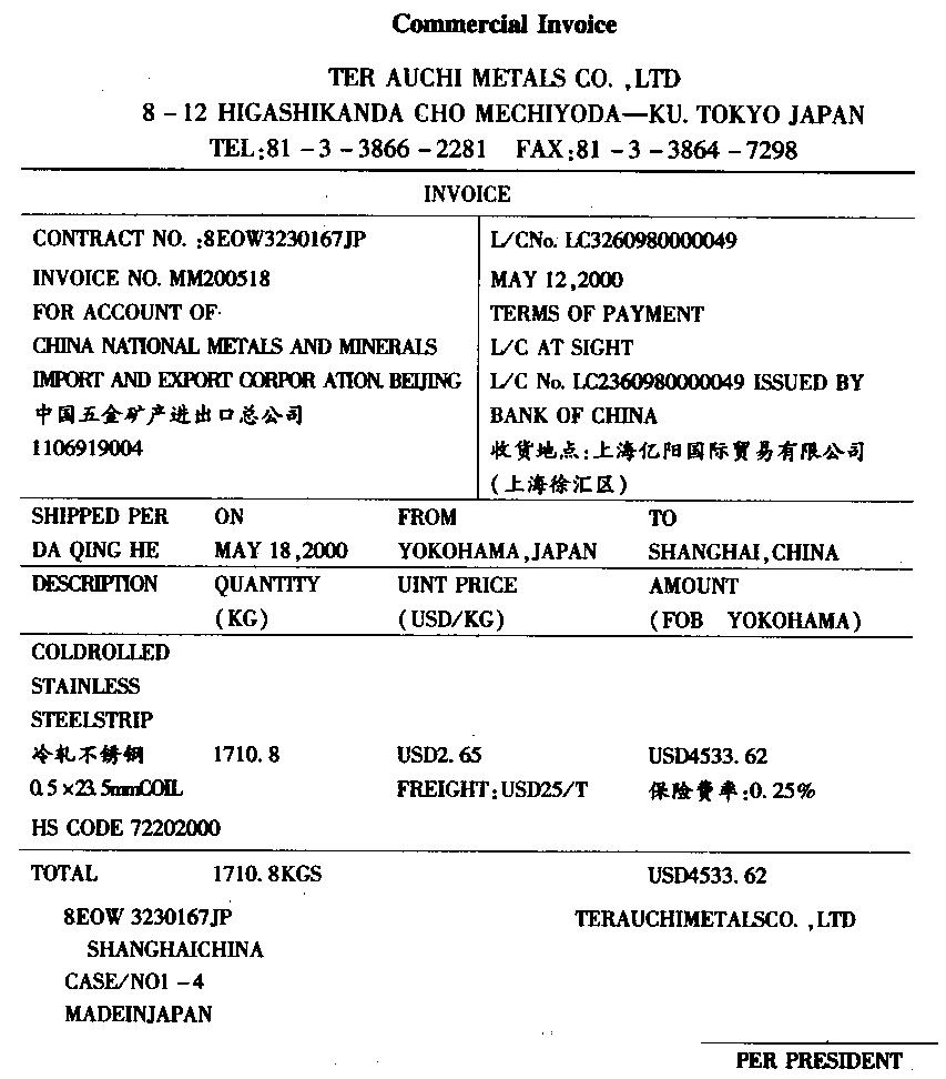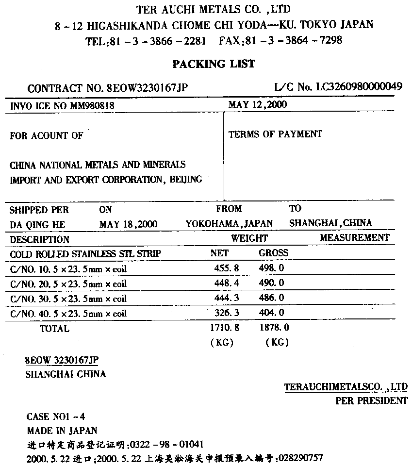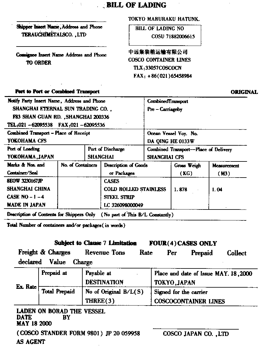 | 正确答案:21.B;22.A;23.A;24.C;25.A;26.C;27.D;28.D;29.C;30.B;31.B;32.B;33.C;34.B;35.A;36.D;37.A;38.C;39.D;40.D 解题思路:(1).装箱单已明示,该进口货物于"2000.5.22在上海吴淞海关申报"可知,该进口货物的入境地海关为"吴淞海关"。(注:现行填制规范答案应为"吴淞海关2202"。) (2).从海运提单中"Ocean Vessel Voy.N0.:DA QING HE 0133w"可知该进口货物的船名和航次,从而可判断该运输方式栏应填"江海运输"。 (3).从发票可知,"中国五金矿产进出口总公司(1106919004)"为在海关注册并对外签订合同的进口企业,因此,经营单位栏应填"中国五金矿产进出口总公司"。(注:现行填制规范答案应为"中国五金矿产进出口总公司1106919004"。) (4).从提单的右上角"B./1NO:COSU71882006615"可知。该进口货物的提运单号应填"COSU71882006615"。 (5).在所给的资料中并未明示该进口货物的贸易方式,因此,应视为"一般贸易"。 (6).提单中"Ocean Vessel Voy.No.DA QING HE0133W"已明示该进口货物的船名和航次。根据运输工具名称栏填写格式:船名+"/"+航次号。因此,该运输工具名称栏应填"Da Qing He/0133w"。 (7).根据报关单填制规范,贸易方式为"一般贸易",其所对应的征免性质栏应填"一般征税"。 (8).发票已明示"收货地点:上海亿阳国际贸易有限公司",因此,该进口货物的收货单位应填"上海亿阳国际贸易有限公司"。 (9).境内目的地实为收货单位所在地,发票已明示"收货地点:上海亿阳国际贸易有限公司(上海徐汇区)",因此,该进口货物的境内目的地栏应填"上海徐汇区"。 (10).从提单中"4CASES"可知,该包装种类为"木箱",因此,包装种类栏应填"木箱"。 (11).从提单中"Pott of Loading:YOKOHAMA,JAPAN"可知,该进口货物的装货港为"日本横滨",从而可判断其起运国(地区)应填"日本",注意是国家名而不是港口名。 (12).运费是用于填写运费单价、总价和运费率。运费单价的填写格式为:运费币值代码+"/"+运费单价的数值+"/"+运费单价标记。因此,如果运费为每吨25美元,运费栏应填"502/25/2"。 (13).根据报关单填制规范,保费是用于填写保险费总价或保险费率,保险费率的填写格式为:直接填报保费率的数值。发票已明示"保险费率:0.25%",因此,保费栏应填"0.25"。 (14).从装箱单中"CONTRACT NO.8EOW3230167JP"可知,该进口货物的合同协议号栏应填"8EOW3230167JP" (15).从提单中"4CASES"及装箱单的"NO.DESCRIPTION"可知,该进口货物的件数为"4"。 (16).根据报关单填制规范,贸易方式为"一般贸易",其所对应的征免栏应填"照章征税"。 (17).装箱单中"GROSS:1,878.0"已明示,该进口货物的毛重应填"1,878"。 (18).从提单中"Marks& Nos."可知,该进口货物的标记唛码及备注栏应选"C"。 (19).发票已明示"USD"的美元货币符号,因此,币制栏应填"美元"或"USD"。 (20).发票已明示"HSCODE72202000",因此,商品编码栏应填"72202000"。 |