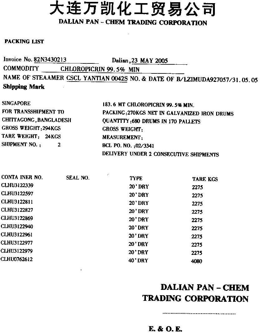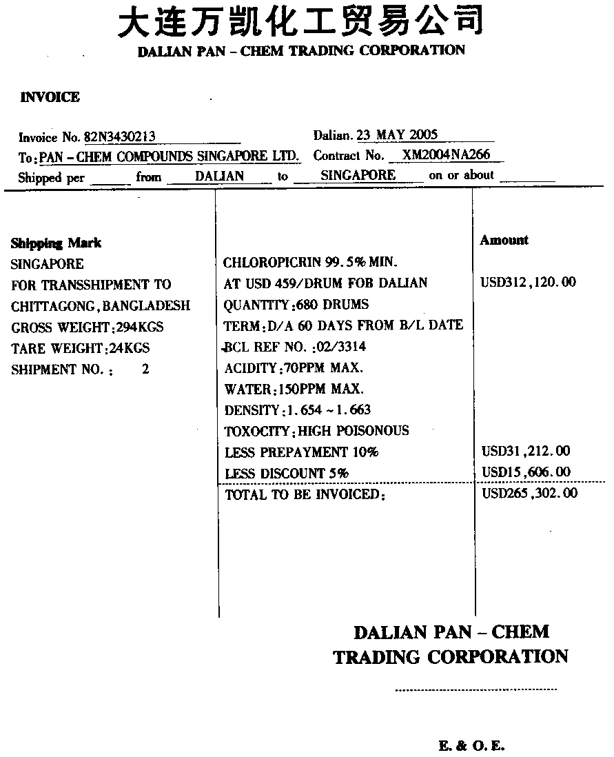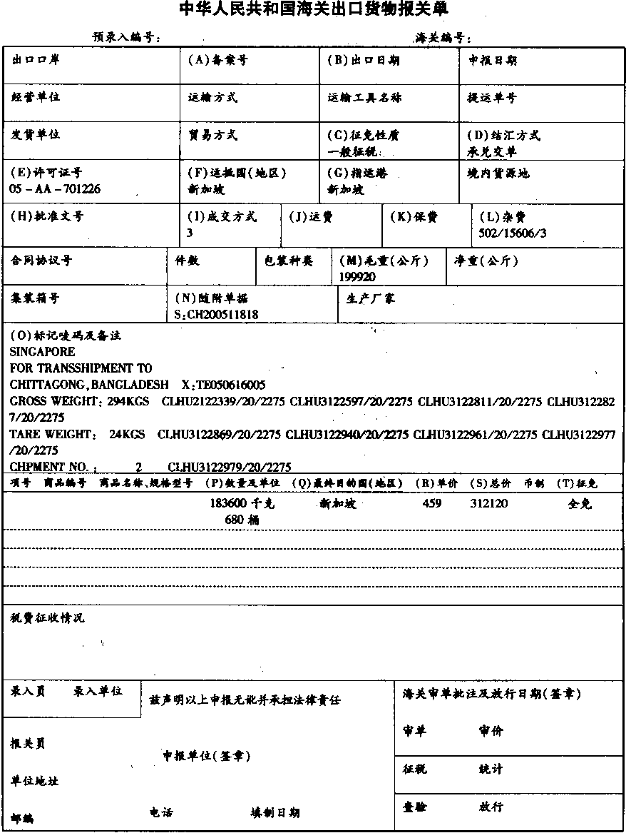 | 41.资料1:大连万凯化工贸易公司(210291××××)代理大连万凯化工有限公司(210225××××)对外签约出口三氯硝基甲烷(无出口税,法定计量单位为千克)。经营单位持有毒化学品出口环境管理放行通知单(代码x,证号TE050616005)、出口农药登记证明(代码S,证号CH200511818)和出口许可证(05-AA-701226),于2005年5月31日向海关申报,次日货物出口。 资料2: ![]() 资料3: ![]() 资料4: ![]() |