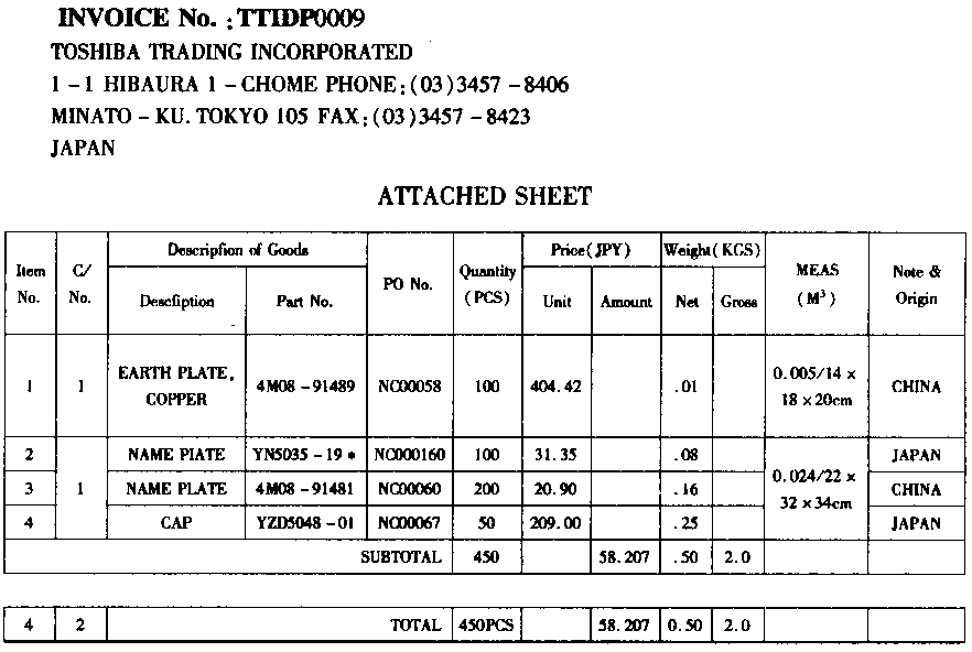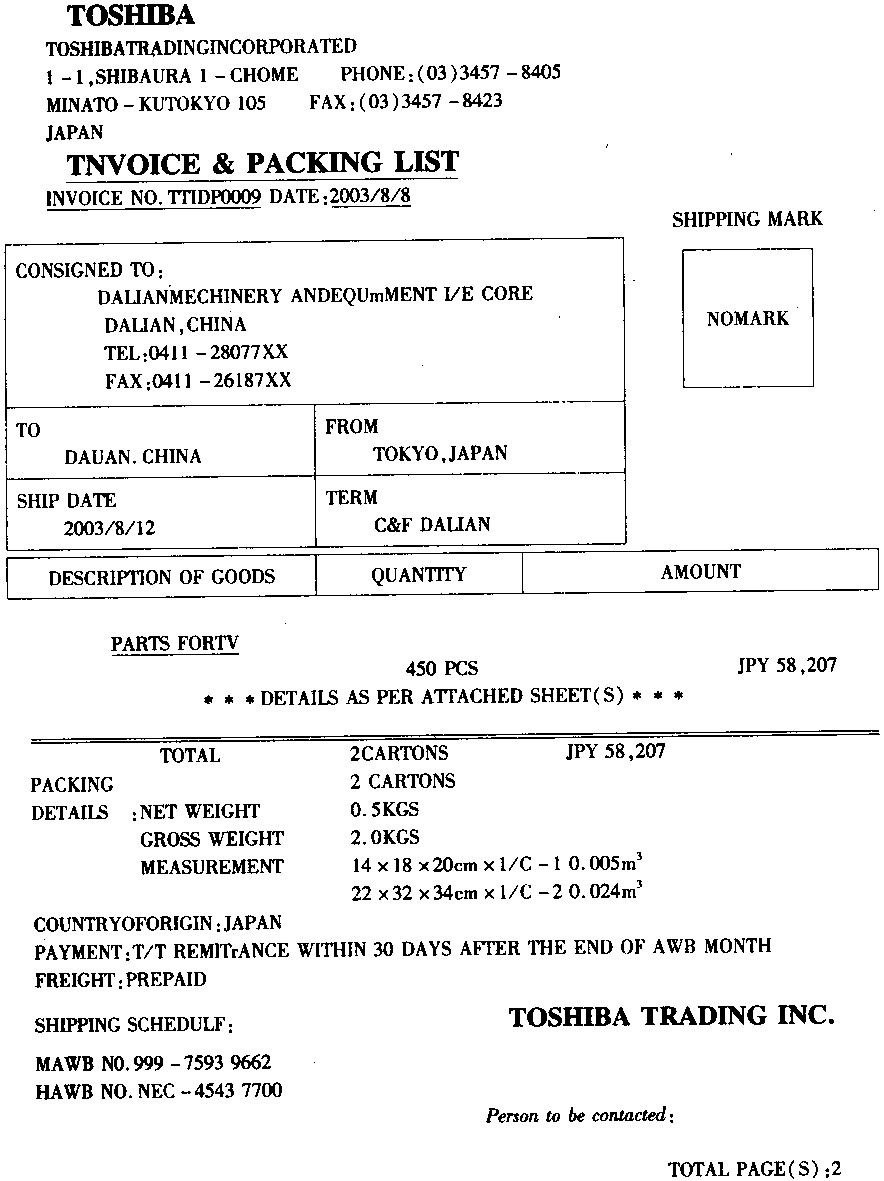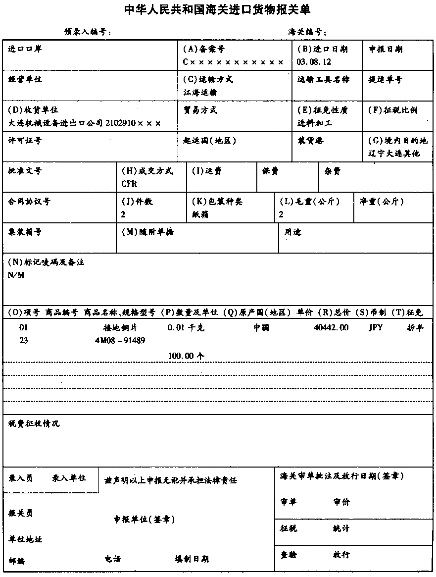 | 43.资料1: 大连机械设备进出口公司(2102910×××)进口一批电视机零件,其中发票第1项商品对应进料非对口手册第23项料件,法定计量单位为千克;发票第2~4项为一般贸易进口货物。装载货物的运输工具于2003年8月12日申报进境。 资料2: ![]() 资料3: ![]() 资料4: ![]() |