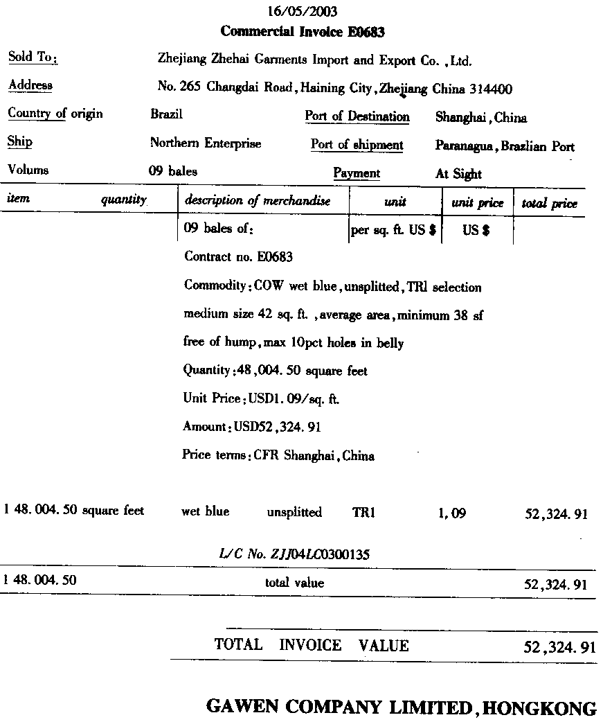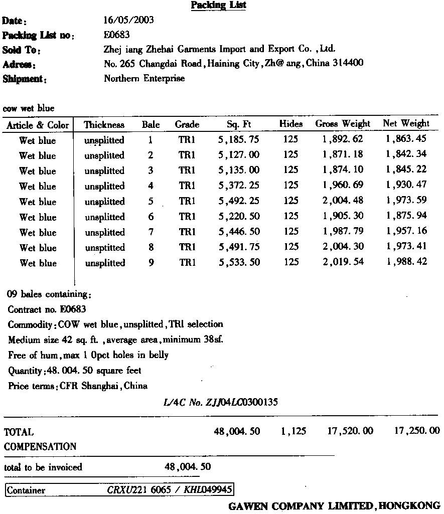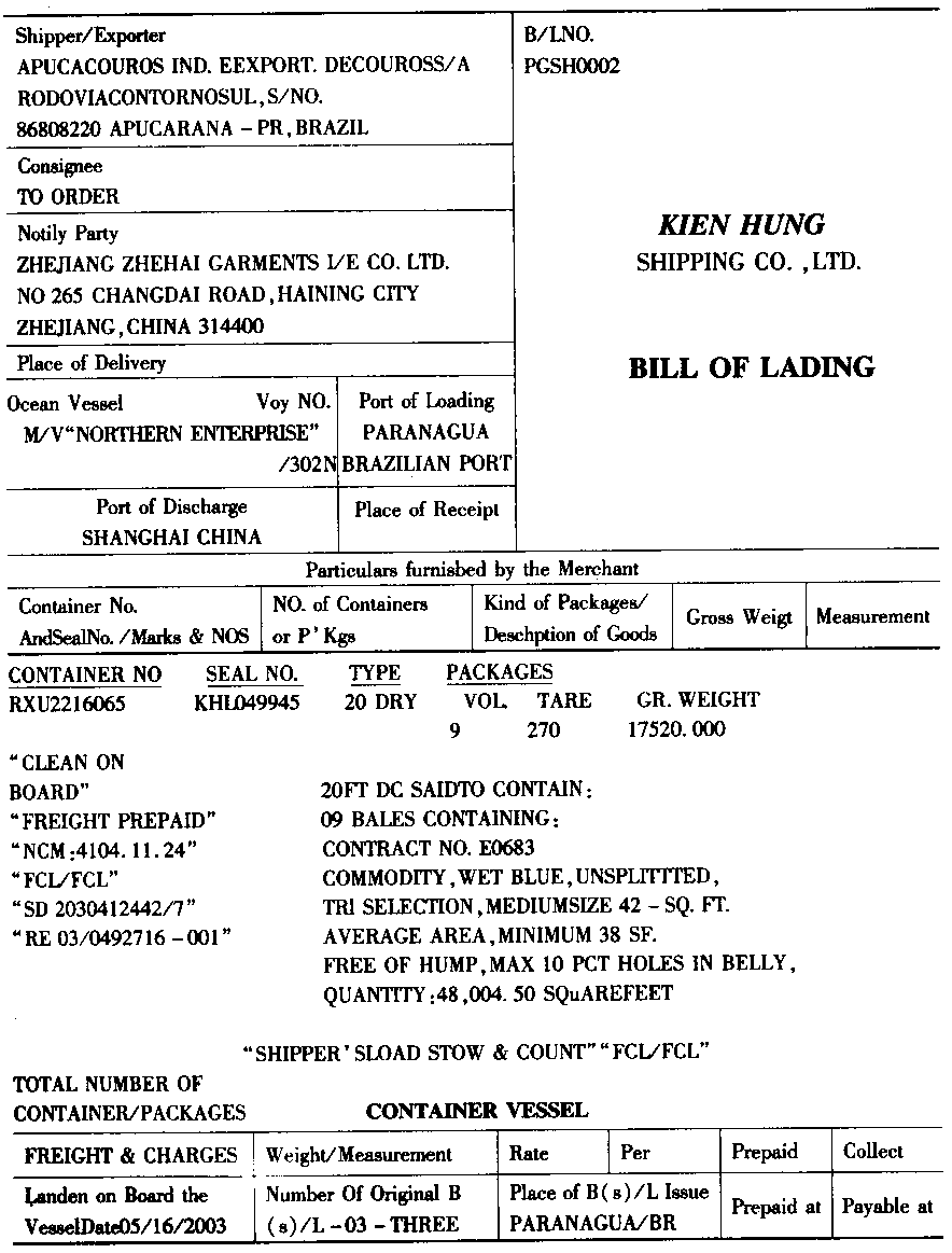 | 资料1 浙江浙海服装进出口公司(3313910194)在对口合同项下进口蓝湿牛皮,委托浙江嘉宁皮革有限公司(3313920237)加工牛皮沙发革。承运船舶在帕腊纳瓜港装货启运,航经大阪,又泊停釜山港转"HANSASTAVANGER"号轮HV300W航次(提单号:HS03D8765)于2003年7月30日抵吴淞口岸申报进境。经营单位委托上海某货运代理公司持C29083100693号手册和310200103036124号入境货物通关单(代码:A)于次日向海关申报货物进口。该货物法定计量单位为千克,海运费、港杂费合计1500美元,保险费为140美元。 (二)资料2 ![]() (三)资料3 ![]() (四)资料4 ![]() (五)资料5 ![]() 请根据以上资料,填制进口货物报关单以下栏目: |