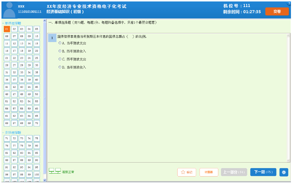 标题栏从左到右,依次显示应试人员基本信息、本场考试名称、考试科目名称、机位号、考试剩余时间、“交卷”按钮。