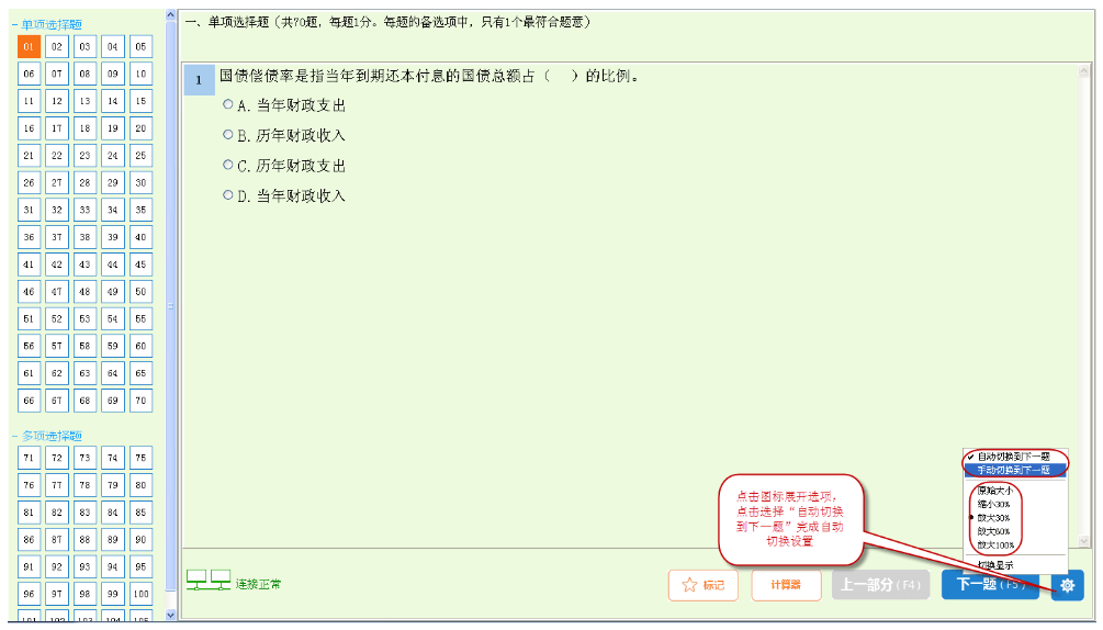 3. 选择“自动切换到下一题”模式时,在答题完成后自动跳转到下一题。(自动切换设置只对单项选择题有效,对多项选择题、案例分析题无效)