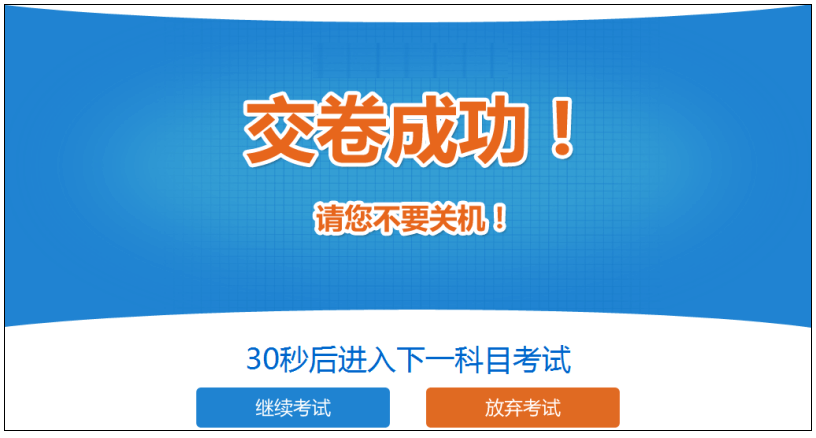 4. 同时报考《经济基础知识》科目和《专业知识与实务》科目的应试人员第一科目交卷成功后,经过30秒倒计时后,系统会自动进入下一科目作答界面。应试人员也可以点击“继续考试”按钮,立即进入下一科目作答。如果应试人员不想继续作答下一科目,可以点击“放弃考试”按钮,结束当次的考试。30秒倒计时的时间不计算在作答时间内。