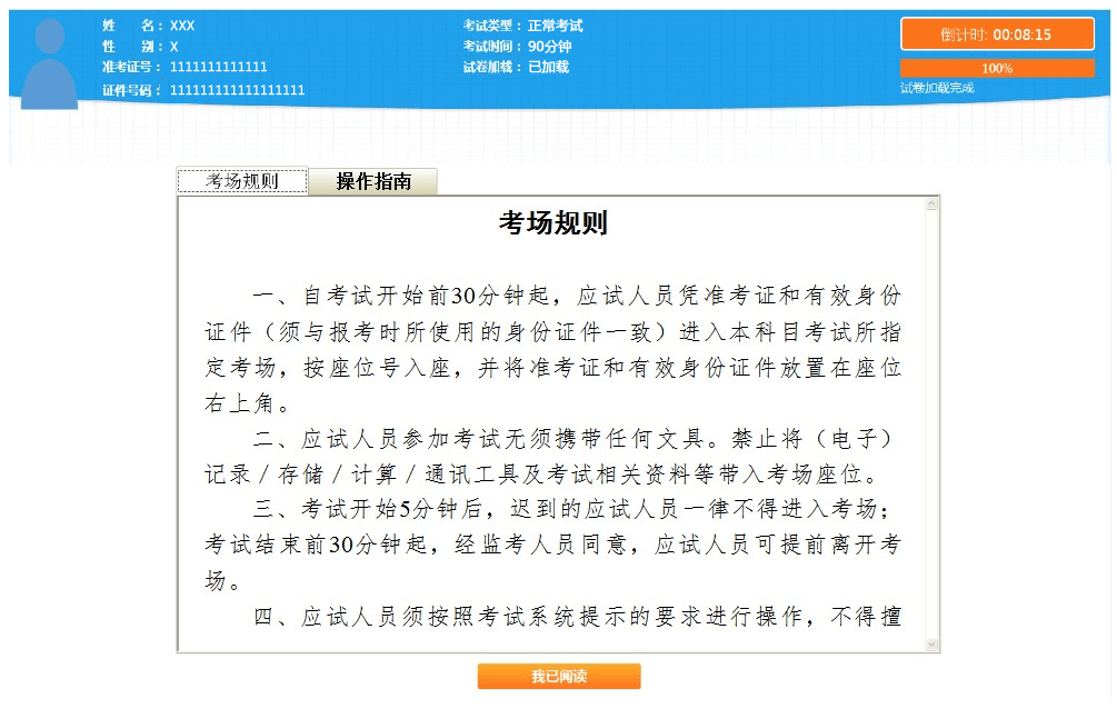 在等待开考界面,请应试人员利用考前等待时间认真阅读《考场规则》和《操作指南》。