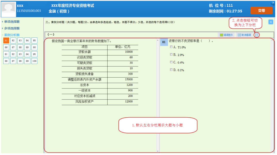 案例分析题默认左右分栏展示案例背景与试题。点击切换按钮可以切换分栏模式。