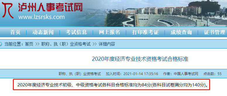 2020年度经济专业技术初级、中级资格考试各科目合格标准均为84分(各科目试卷满分均为140分)。