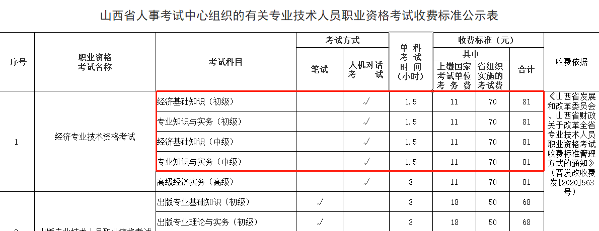 根据《山西省发展和改革委员会、山西省财政厅关于改革全省专业技术人员职业资格考试收费标准管理方式的通知》(晋发改收费发[2020]563号)的规定,现将山西省人事考试中心组织实施的有关专业技术人员职业资格考试收费标准予以公示。其中,上缴国家考试单位的考务费标准如有变化,按调整后的标准执行。