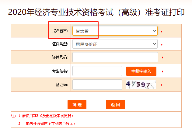 2020年甘肃高级经济师考试准考证打印入口官方显示已开通,准考证打印时间原定于9月5日-11日开通。现提前开通。(注意:考生可输入证件号进行打印,如输入后提示尚未开通,请考生按原定时间9月5日起再进行打印。)
