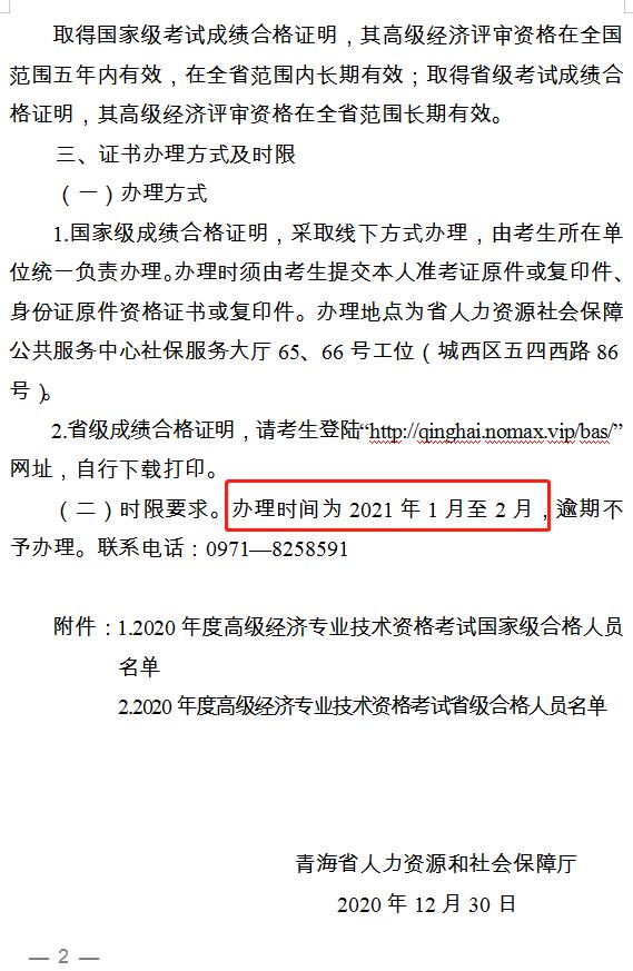 青海省人力资源和社会保障厅关于公布2020年度高级经济专业技术资格考试合格标准及证书办理有关事项的通知