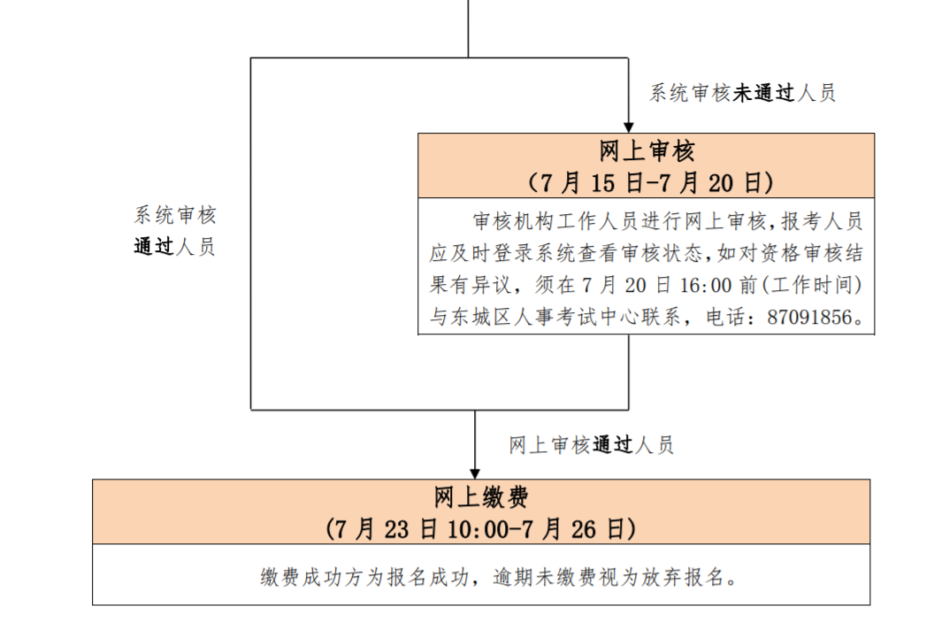 报考人员须登录北京市人力资源和社会保障局官方网站“人事考试服务频道”(网址:http://rsj.beijing.gov.cn/ ywsite/bjpta/,以下简称人事考试服务频道),进入“考试报名” 栏目,点击本项考试报名链接进行报名,网上填报信息并通过网上审核的人员方可进行网上缴费,报名流程详见附件。