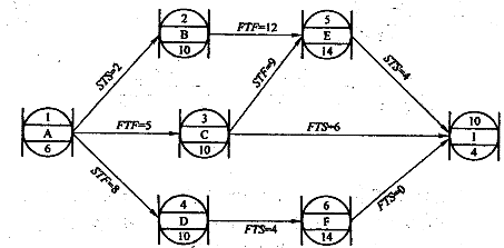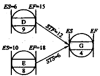 | 正确答案:B 解题思路:本题主要考查搭接网络图中各种搭接关系的含义和最早开始时间的计算。STF为开始到结束的时距,由工作D和G的关系可知,工作G最早开始的时间为6+12-4=14天。 |