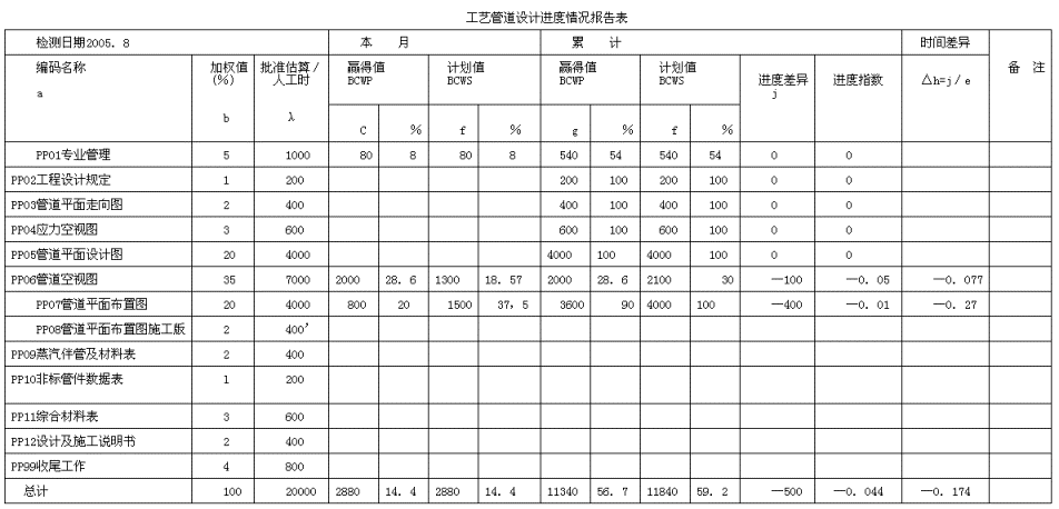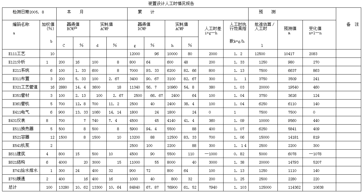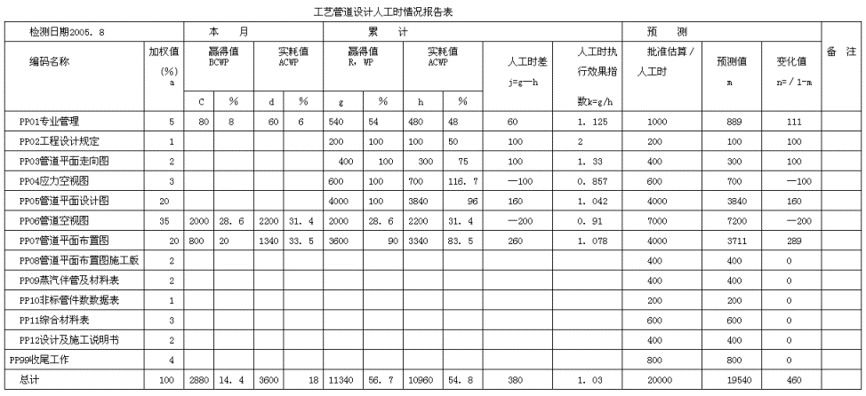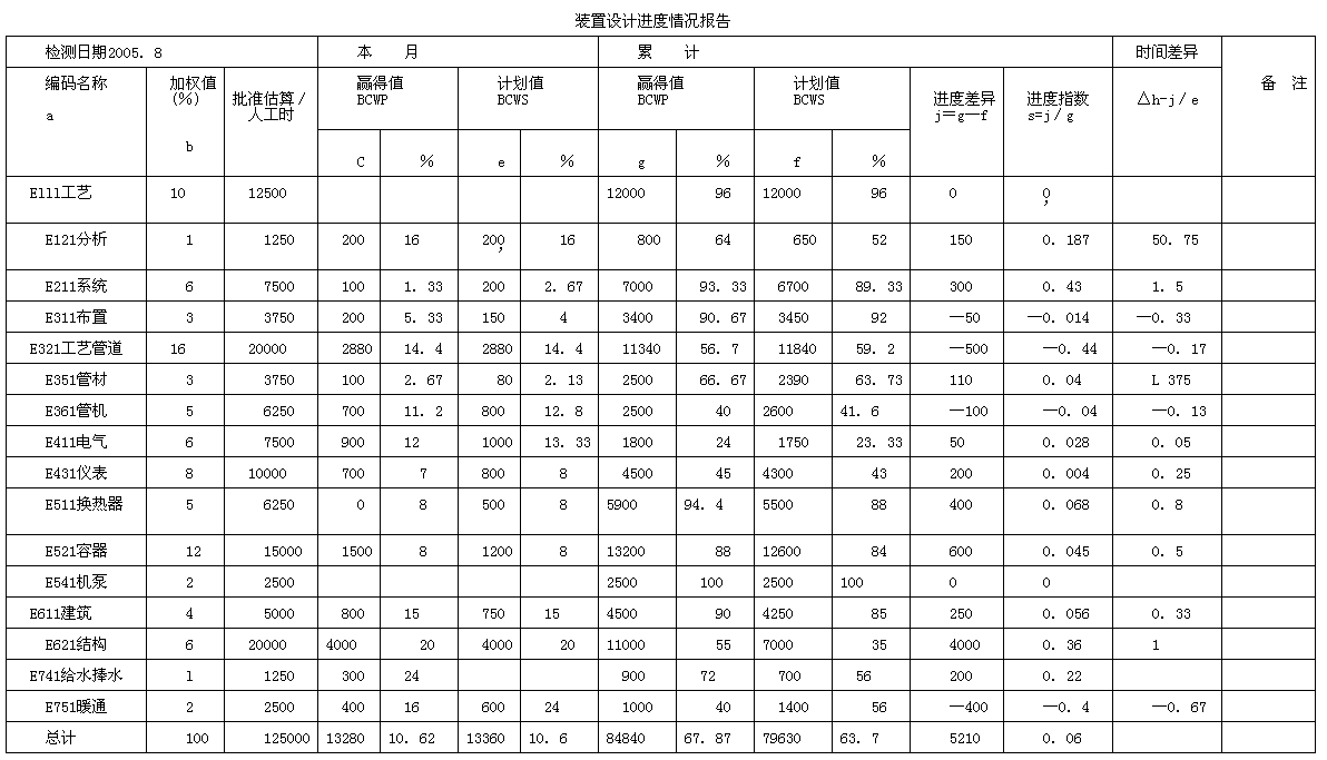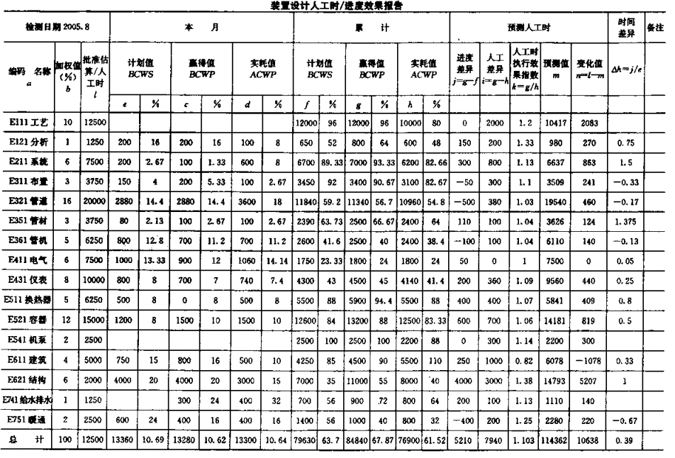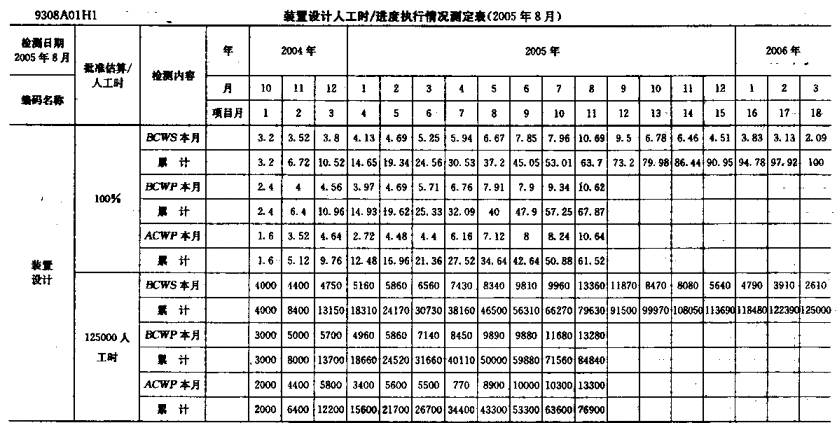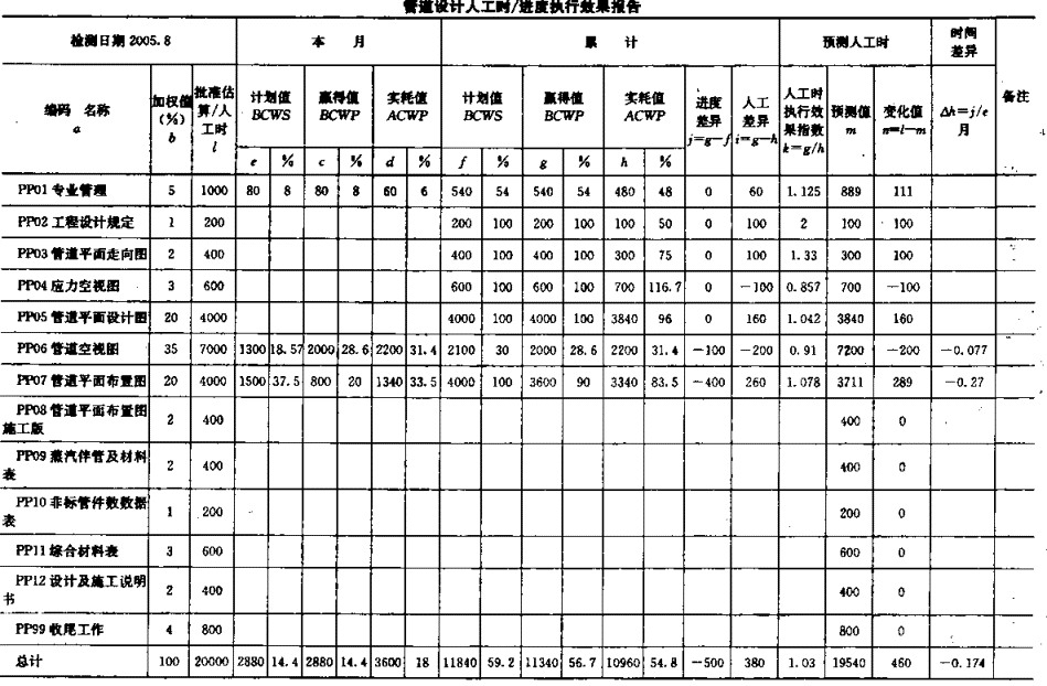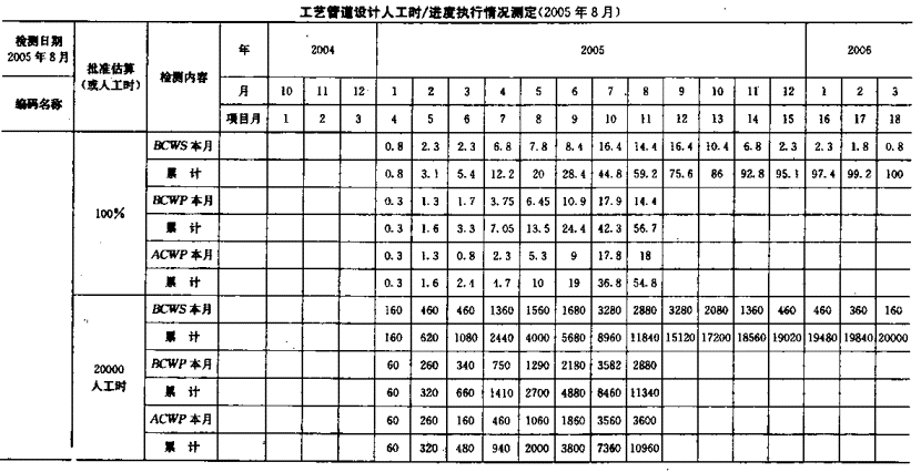 | 1.CD合成剂项目人工时(费用)/进度综合检测过程 项目有关情况 项目名称:CD合成剂 项目范围:化工装置设计 项目共分为三个装置:A01合成装置、A02合成装置、A03分离装置 CD合成剂项目工作分解结构系统如下图所示。 ![]() 根据该项目资源类别、特性以及费用项目和费率不同,在实际工作中按照费用类别分成:劳务人工时检测、直接材料费用检测、管理及非工资费用检测、开车费用检测和其他费用检测5类。其中劳务人工时的检测对象主要是指设计人工时和施工人工时。其特点是CD合成剂项目工作分解结构系统在工程项目费用支付中占有较大比例,国际上一般占总投资的20%~30%。其工作分解可划分得较细,并能对每个工作包或工作任务建立明确的工作里程碑 当设计工作进行到项目月第11个月时即2005年8月,项目部对E321工艺管道设计人工时/进度执行情况进行进度/费用综合检测得m管道设计人工时执行情况报告测定表;得出E321工艺管道设计下各项工作设计人工时/进度执行情况报告,如下列表格所示 同时,项目部对9308A01净化装置设计人工时/进度执行情况也进行了进度/费用综合检测,得出装置设计人工时/进度执行情况测定表;得出9308A01净化装置设计下各项工作设计人工时/进度执行情况报告,如下列表格所示。 ![]() ![]() ![]() ![]() ![]() ![]() 问题: (1)简述该设计项目人工时/进度综合控制的步骤 (2)本案例的BCWS、BCWP、ACWP的值是如何确定的? (3)根据E321工艺管道设计人工时/进度执行情况进行的人工时/进度综合检测表和E321工艺管道设计下各项工作设计人工时/进度执行情况报告表,做出一份E321工艺管道设计人工时/进度执行效果报告 (4)画出工艺管道设计进度曲线 (5)画出工艺管道设计人工时曲线 (6)画出工艺管道设计人工时/进度综合控制曲线 (7)画出工艺管道设计人工时负荷图 (8)根据9308A01净化装置设计人工时/进度执行情况进行的人工时/进度综合检测表和9308A01净化装置设计下各项工作设计人工时/进度执行情况报告,做出一份9308A0 1净化装置设计人工时/进度执行效果报告 (9)画出净化装置设计进度曲线 (10)画出净化装置设计人工时曲线 (11)画出净化装置设计人工时/进度综合控制曲线 (12)画出净化装置设计人工时负荷图 (13)从本案例给出的条件,分析当设计进行到第8个月时工艺管道设计和净化装置设计的进度和人工时消耗状况 |