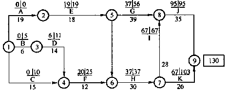 1.南方某水泥厂机电工程建设项目,业主通过招标投标决定由华南安装公司承接该工程,华南安装公司与业主签订了工程合同。合同工期为130天,合同规定:工期提前一天奖励5000元,每拖后一天罚款5000元。通过双方协调编制了如下图所示的网络计划,经业主同意后实施;计划执行过程中,出现了下列一些情况;![]() (1)因业主不能及时供应设备,使E延误3天,C延误2天,H延误3天 (2)因机械发生故障检修,使G延误2天,K延误1天 (3)因土建设备基础孔偏移问题,使F延误3天 (4)因公网停电,使F延误一天,1延误1天 (5)安装单位在J施工过程中采取了加快施工的技术措施,业主付给安装单位技术措施费1万元,使J施工时间缩短了4天 问题: (1)施工单位就上述5种情况中哪些内容可以向业主提出工期补偿? (2)指出关键线路? (3)该工程的实际工期为多少天? (4)可顺延工期为多少天? (5)安装单位得到的提前奖是多少? |