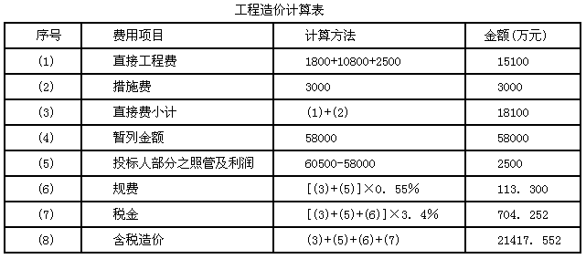 | 11.【案例3】 某酒店工程,建筑面积为67000m ,为钢筋混凝土框架一剪力墙结构,其各项投标价目为:措施项目:3000万元;土方工程:1800万元;建筑工程:10800万元;室外工程:2500万元;其他项目为60500万元(其中暂列金额为58000万元);规费费率按规定为0.55%;税金按国家规定取3.4%。 问题: 1.请简述直接费、间接费、规费和税金的构成。 2.请简述其他项目的清单构成。 3.当以直接费为计算基础时,请列表计算该项目的建安工程造价(保留到小数点后三位)。 |