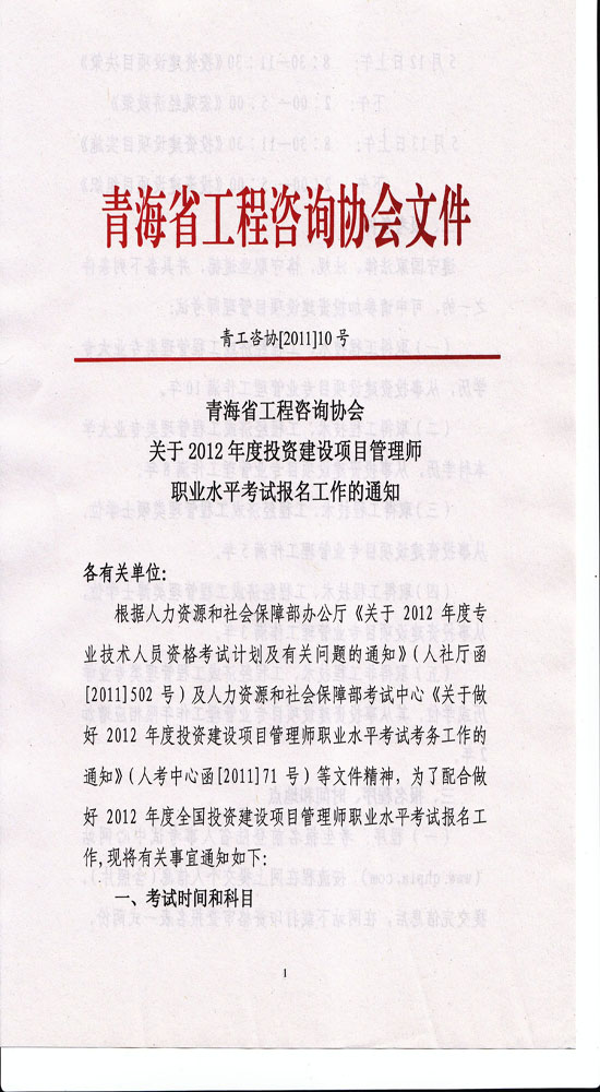青海:2012年投资项目管理师职业水平考试报名工作的通知