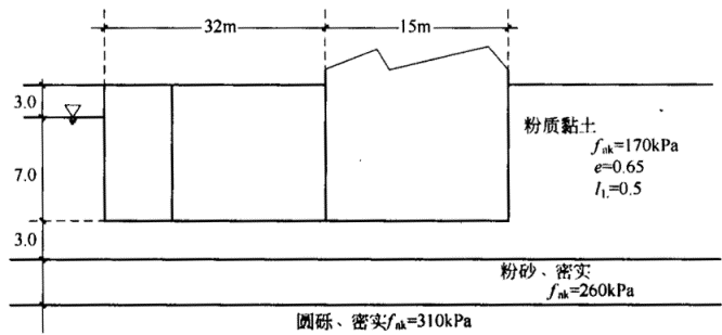 3.某高层筏板式住宅楼的一侧设有地下车库,两部分地下结构相互连接,均采用筏形基础,基础埋深在室外地面以下10m,住宅楼基底平均压力Pk为260kN/㎡,地下车库基底平均压力Pk为60kN/㎡,场区地下水位埋深在室外地面以下3.0m,为解决基础抗浮问题,在地下车库底板以上再回填厚度约0.5m,重度为35kN/m 的钢碴,场区土层的重度均按20kN/m 考虑,地下水重度按10kN/m 取值,根据《建筑地基基础设计规范》(GB50007-2002)计算,住宅楼地基承载力fa最接近( )。![]() |