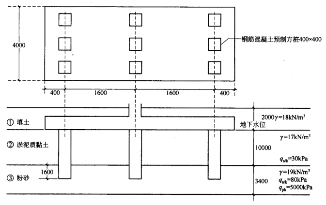 5.某桩基工程安全等级为二级,其桩型平面布置、剖面和地层分布如图所示,土层及桩基设计参数见图中注,承台底面以下存在高灵敏度淤泥质黏土,其地基土极限阻力标准值qck=90kPa,已知:ηs=0.9,ηp=1.35,γs=yp=1.65,请按《建筑桩基技术规范》(JGJ94-94)非端承桩桩基计算复合基桩竖向承载力设计值,其计算结果最接近( )。![]() |