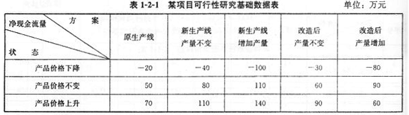 | 1.某建设项目可行性研究阶段拟定了两个生产线方案,项目实施期为10年。 方案1:对原有生产线进行改造,投资200万元,改造成功的概率为0.6。改造后前三年为投产试营期,综合风险变化因素与生产效率预计每年净现金流量为50万元。 方案2:安装新生产线,投资320万元,项目成功概率为0.8。安装后前3年为投产试营期,预计每年净现金流量为60万元。 若方案1、方案2均不成功,拟采用原生产线生产,并保持原生产线 水平(相关数据见表1-2-1)。两方案设计效果有可能使产量增加或不变。根据市场调研,今后10年内产品的价格下跌的概率为0.1,保持不变的可能性为0.5,价格上升的概率为0.4。 问题:假设今后10年内行业基准收益率为12%,以10年为项目计算期,试用决策树分析法对上述方案进行评价。 |