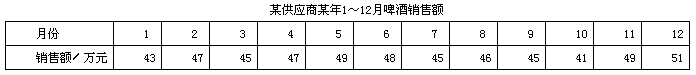1.某供应商某年1~12月啤酒销售额见表,请用简单移动平均法预测下一年第一季度该供应商啤酒销售额(n=3)为( )万元。![]() |