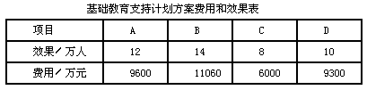 3.某地方政府拟实行一个基础教育支持计划,有四个方案可供选择,见表,如果没有资金限制,应该采用的是( ),根据经验,基准(C/E) 为800元/人。![]() |
