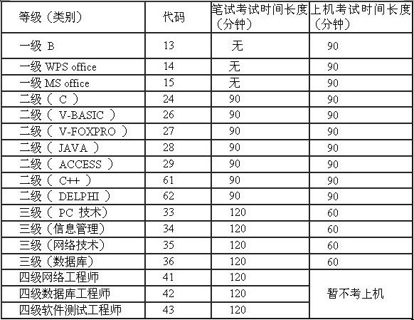 每一级别考试时间由上机考试软件自动控制。上机考试软件为 WINXP 考试环境,一级 B 考试为 OFFICE 2003 版,在三级的 PC 技术、信息管理技术、网络技术、数据库技术四个科目中, PC 技术上机考试考汇编语言,其他三个科目上机考试考 VC 语言。2011年9月已经报考二级、三级的学生,如果笔试或机试中有一项不及格,可以只报考不及格的一项,考试费用不变。