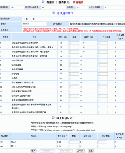 考生可自行选择考试所需教材,若需快递送书服务,则需填写送书地址和邮政编码(为方便快递送达请尽可能写单位地址),订书5本以下(含5本)快递费人民币6元,5本以上快递费人民币8元。每人限订一套教材。考生可登录相关网站免费试听课程,并根据需要自主选择网络辅导学习课程。确认上述信息无误后,按“缴费”按钮,提示如下信息: