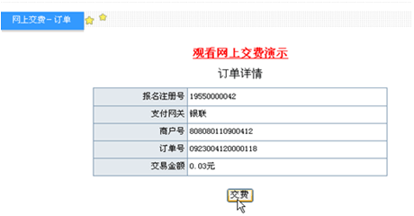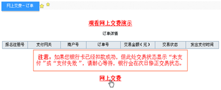 如果当时没有进行网上支付,可在以后登录报名系统从“网上交费”中进行支付,如图5.5: