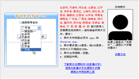 选择报名省份:注意需要自传照片的省份的考生先按页面提示把照片文件准备好,如图2.2.