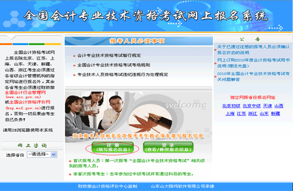 2011年全国会计专业技术资格(初级会计职称、中级会计职称)考试时间定于5月14、15日举行。网上报名于10月11日开始,网上补报名于12月4日开始,除北京、江苏、上海、山东、天津、新疆、兵团、山西、浙江、辽宁、陕西考生通过各自省级会计管理机构指定的报名网站进行报名外,其余各省考生必须通过财政部全国会计行业管理网(www.acc.gov.cn)或全国会计资格评价网(kzp.mof.gov.cn)进行报名。