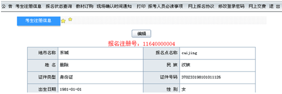 登录后可以查看公告、编辑注册信息(到报名点验证之前可以修改)、报名状态查询、查看报名点发布的现场确认时间通知(各地不一致)、打印报名表、打印准考证、查看考试须知与报名协议、修改登录密码等。如图3.3和图3.4: