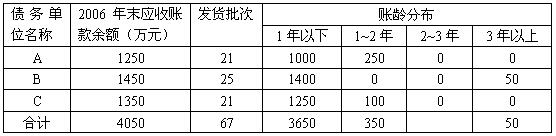 资料一:2006年度,G公司出售铁锭的收入总额为31500万元。所产铁锭的约90%销售给国内A.B.C三家大型国有钢铁冶金企业和韩国、日本的两家冶金企业D.E公司,其余的约10%销售给国内315家小型翻砂、铸造厂。除销售给A.B.C公司的67批次铁锭采用赊销方式(回款期一般为半年)外,销售给A.B.C公司的其他195批次及销售给D.E公司的172批次铁锭均采用现销方式,销售给各翻砂、铸造厂的56余批次铁锭则一律采用预收账款方式。G公司应收A.B.C公司的货款情况如下: