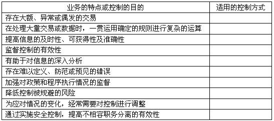 3.注册会计师在了解被审计单位ABC公司的内部控制时,发现该公司相关的内部控制同时含有自动控制和人工控制两种控制方式。由于注册会计师基于以往执业经验认为控制效果受所采用的控制方式的影响,决定在评价控制效果前先对ABC公司针对业务特点和控制目的所采用的控制方式的适当性进行评价。下表是注册会计师罗列的ABC公司相关业务的特点及控制目的。(1)请指出,哪些情形更适用于实施自动控制,哪些情形更适用于进行人工控制。你认为适用于自动控制的,请在相应的业务的特点或控制的目的后的空格中填列“自动”;你认为更适用于进行人工控制的,请在相应空格中填列“人工”。