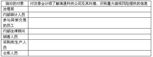 1.为了识别和评估海通科技公司2006年度财务报表的重大错报风险, B注册会计师需要了解海通科技公司及其环境,以评估重大错报风险。为此决定专门实施下列风险评估程序:(1)询问被审计单位管理层和内部其他相关人员;(2)观察和检查。请指出:(1)注册会计师应当从哪些方面对海通科技公司及其环境进行了解?(2)在进行风险评估时,除了实施上述两类专门程序外,注册会计师还可以实施哪些程序?(3)在了解海通科技公司及其环境,以评估重大错报风险时,注册会计师可以向海通科技公司管理层和财务负责人询问哪些主要情况或事项?(4)在了解海通科技公司及其环境,以评估重大错报风险时,除了询问海通科技公司管理层和财务负责人外,注册会计师还考虑询问海通科技公司的其他人员(见下表),以获取对识别重大错报风险有用的信息。请指出:询问这些人员可以对注册会计师了解海通科技公司及其环境识别重大错报风险提供哪方面的信息,将你的答案填入下表中。